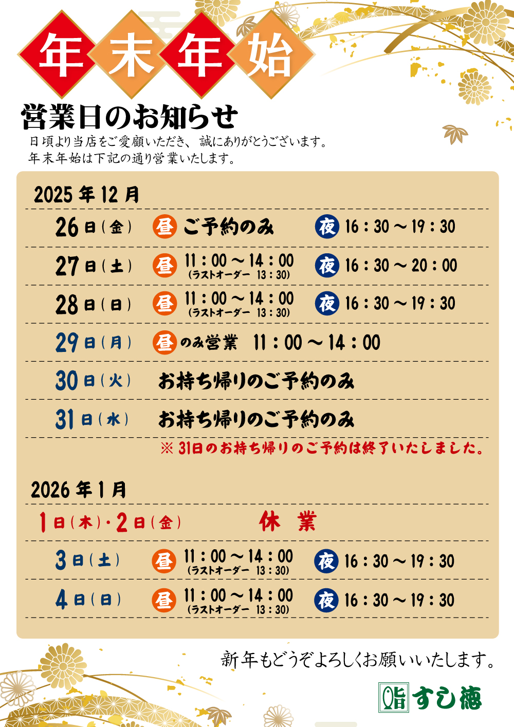 (ラストオーダー 13:30) 16:30~20:00 (ラストオーダー 19:30) ※日・祝日の営業は19:30までになります。 ※出前は19時まで承ります。 |